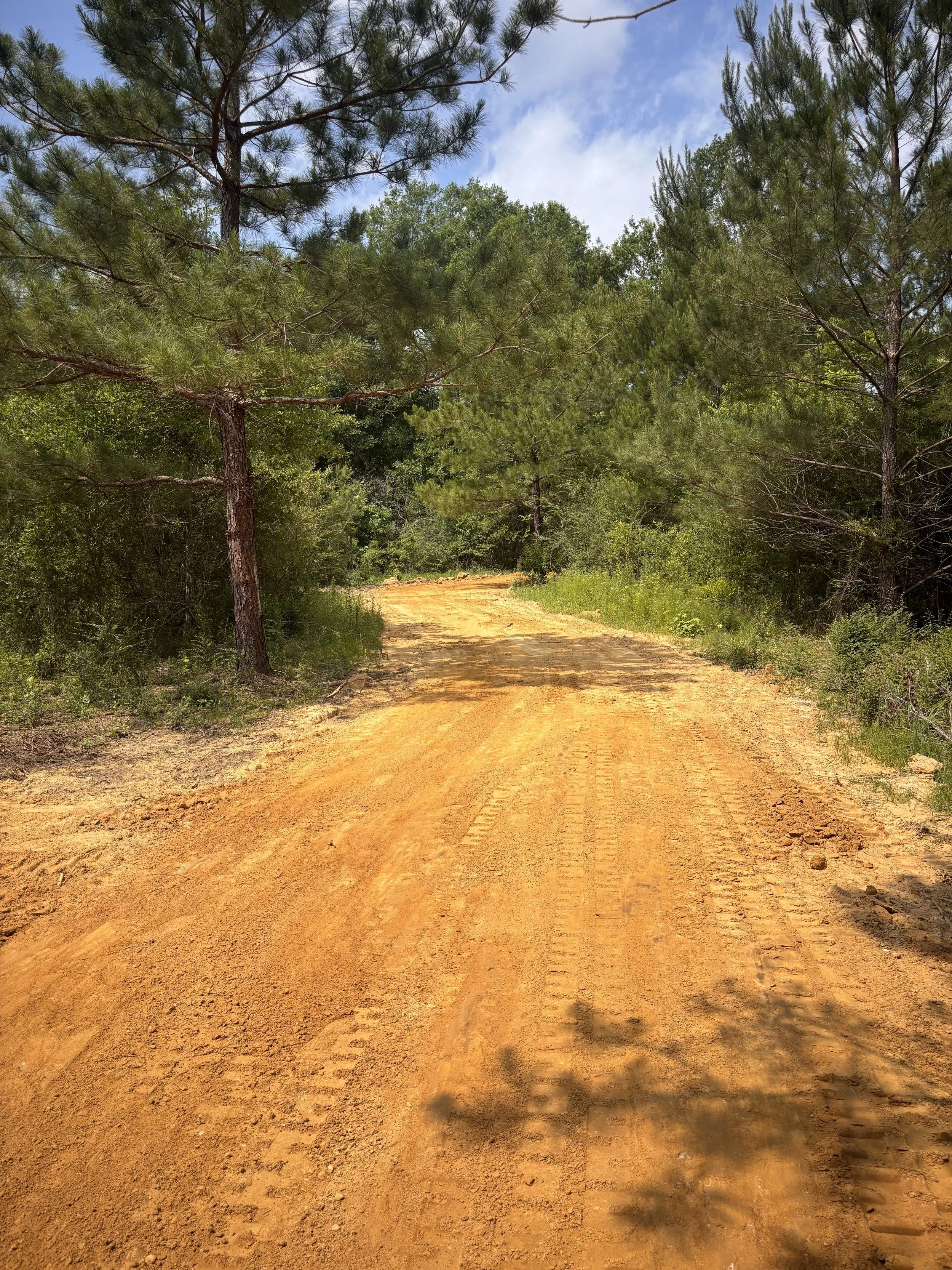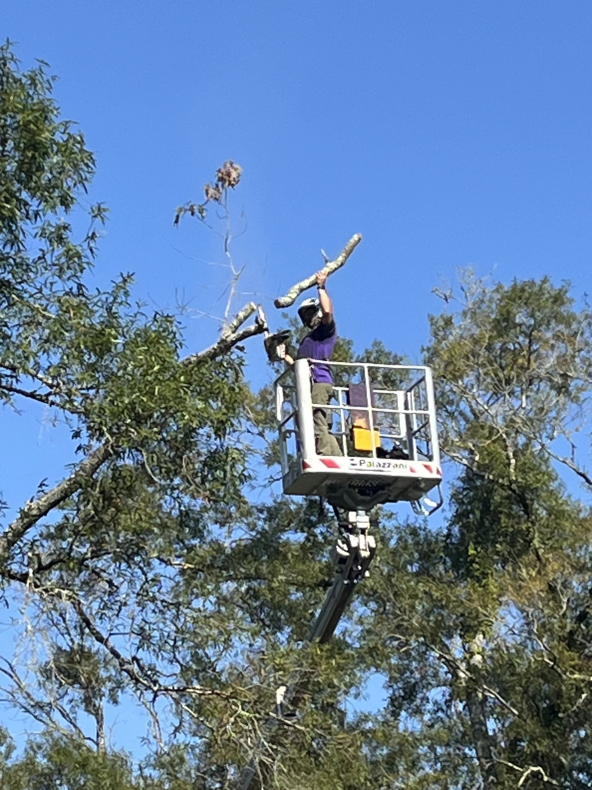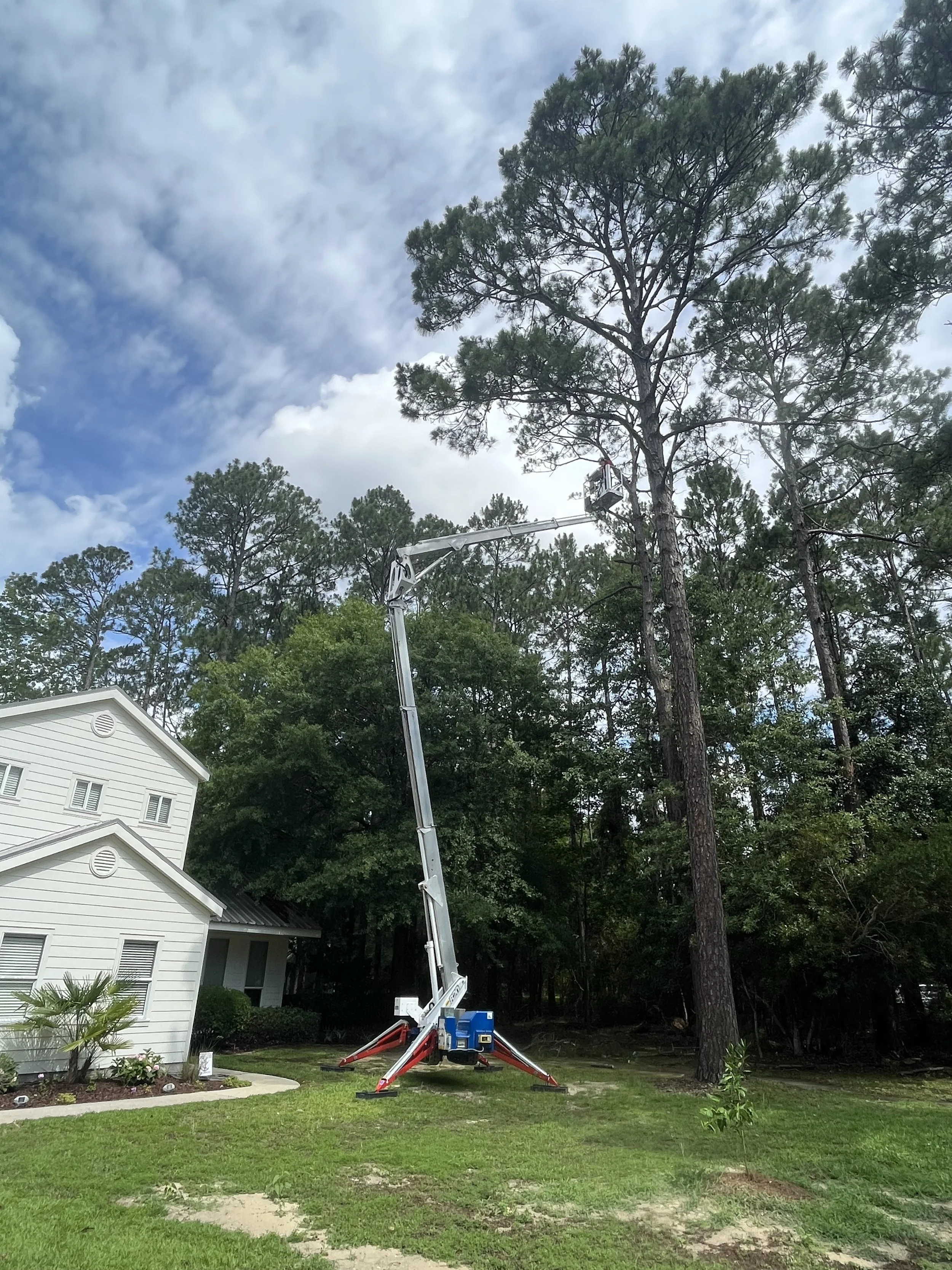 A skid-steer loader is lifting a large cut log into a trailer filled with tree logs, with a backdrop of tall pine trees and a partly cloudy sky.